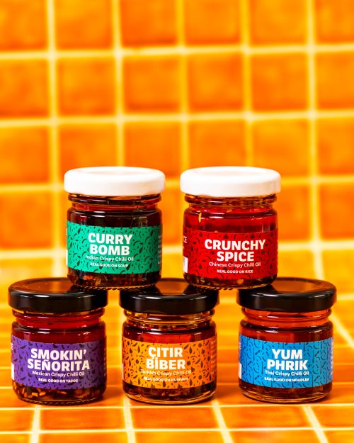 De collectie crispy chili oils van Trouble & Spice combineert pittigheid met knapperigheid, kruiden en rijke umami. Elke variant is geïnspireerd op een specifieke wereldkeuken en laat zien hoe veelzijdig chili olie kan zijn. Verschillende smaken zijn bekroond bij internationale smaakcompetities en worden gewaardeerd om hun balans en karakter.